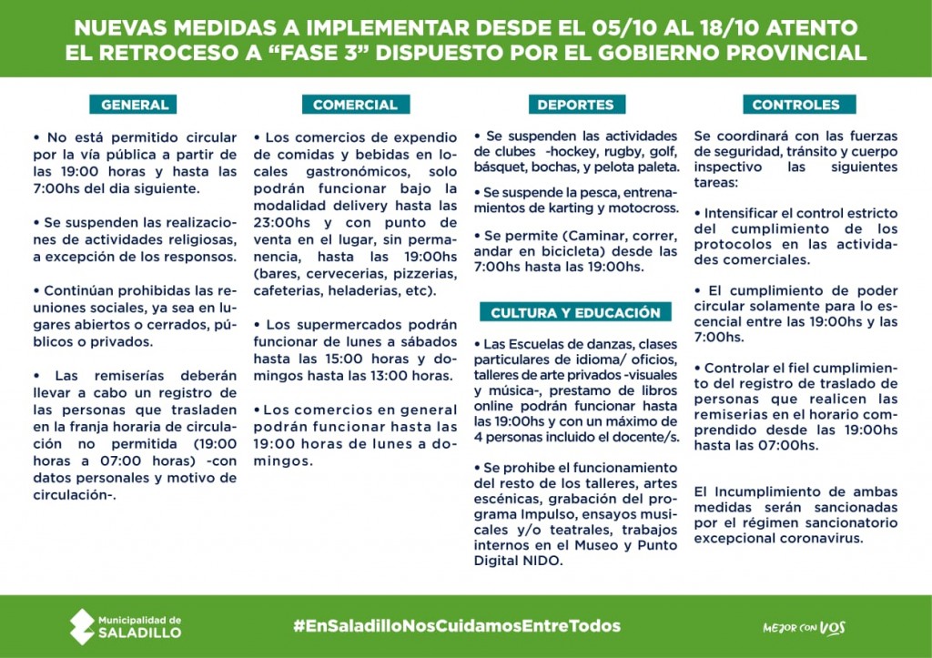 Las nuevas medidas que se cumplirán por 15 días en Saladillo.