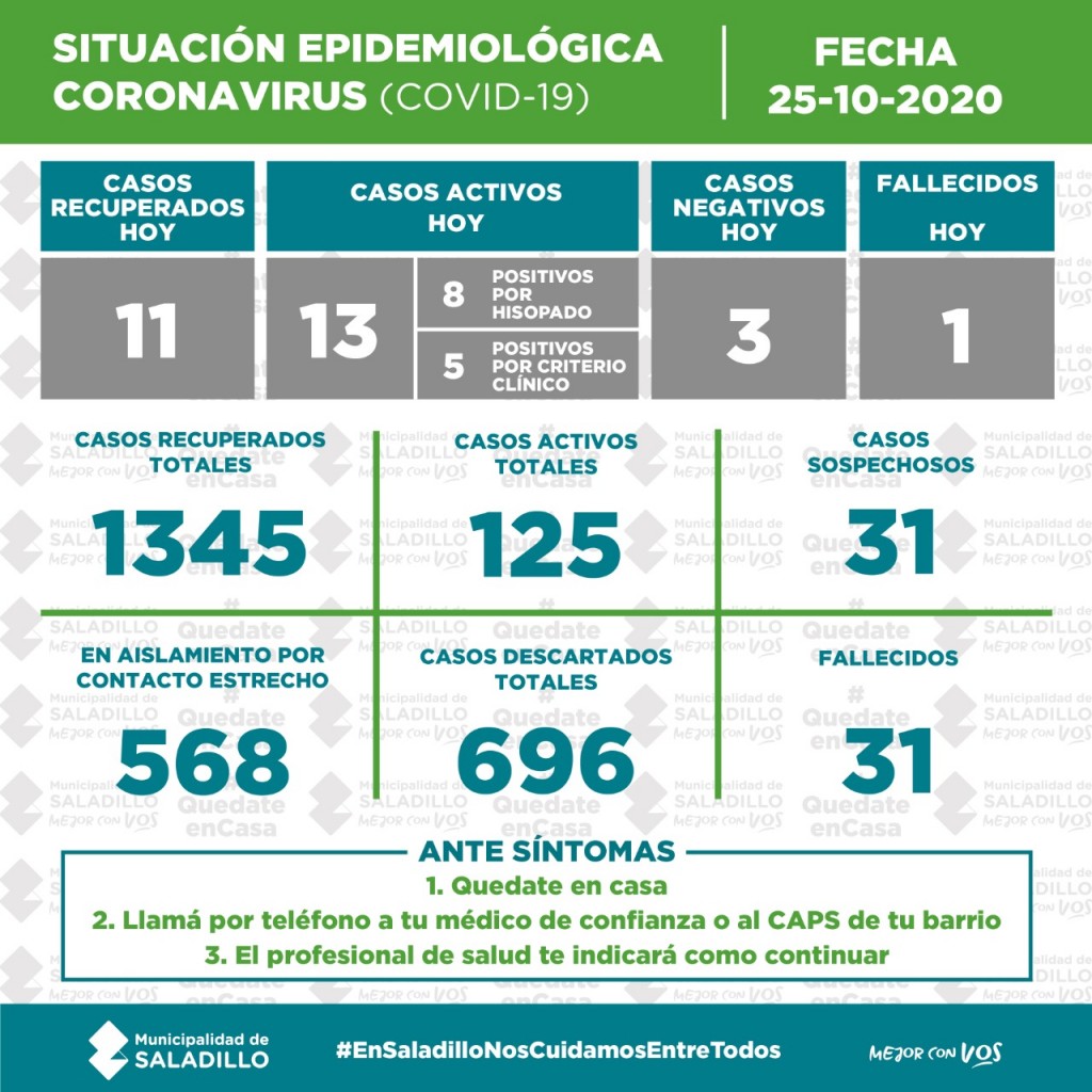 SITUACIÓN EPIDEMIOLÓGICA EN SALADILLO AL 25/10/2020
