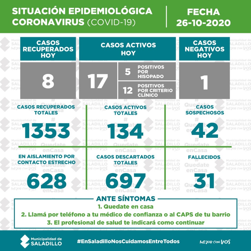 SITUACIÓN EPIDEMIOLÓGICA EN SALADILLO, ARGENTINA Y EL MUNDO al 26/10/2020