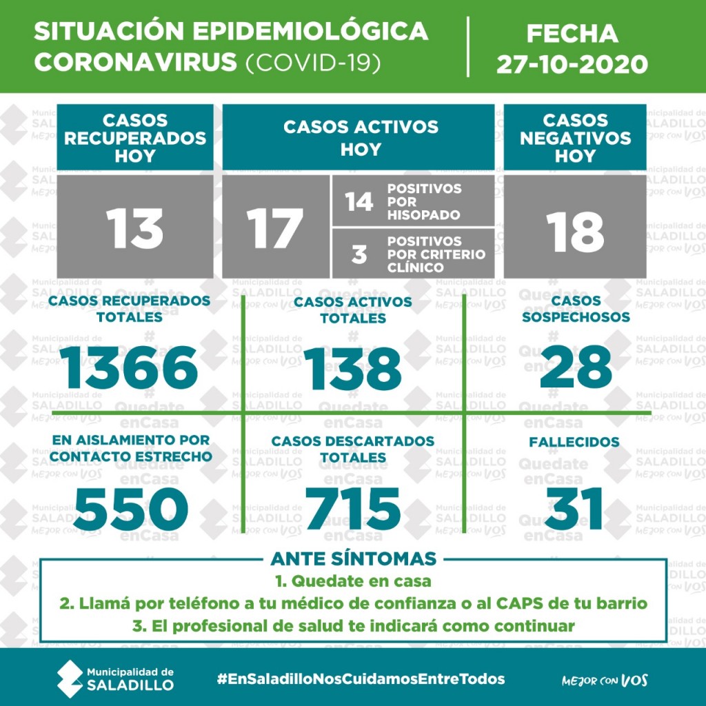 SITUACIÓN EPIDEMIOLÓGICA EN SALADILLO | 27/10/2020