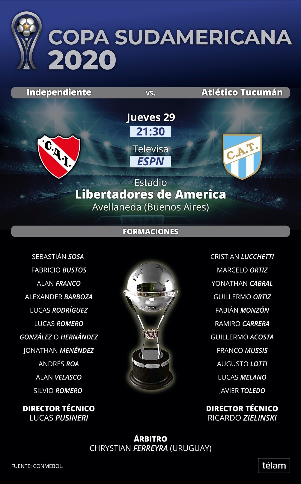 El encuentro se jugará este jueves a partir de las 21.30 (hora de la Argentina) en el estadio Libertadores de América, de Independiente, con el arbitraje del uruguayo Chrystian Ferreyra y televisación de la señal ESPN.