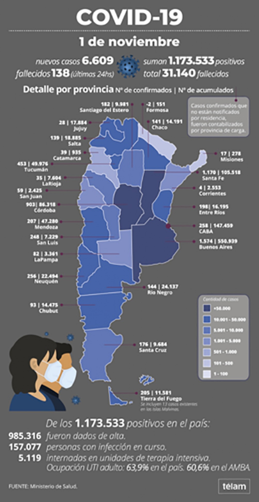 La cartera sanitaria indicó que son 5.119 los internados en unidades de terapia intensiva, con un porcentaje de ocupación de camas de adultos de 63,9% en el país y del 60,6% en la Área Metropolitana Buenos Aires.