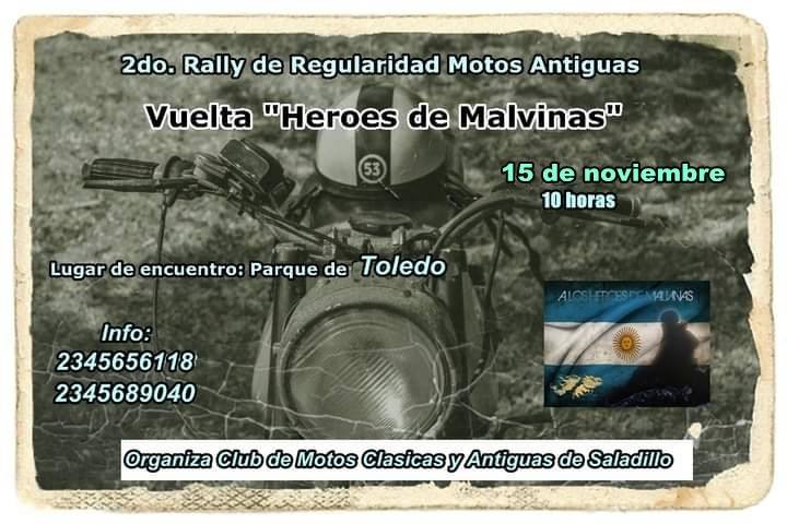 El club de Motos Clásicas y Antiguas de Saladillo se encuentra abocado a la organización del segundo Rally en Saladillo. El mismo se realizará el 15 de noviembre por caminos aledaños a la localidad de Toledo.