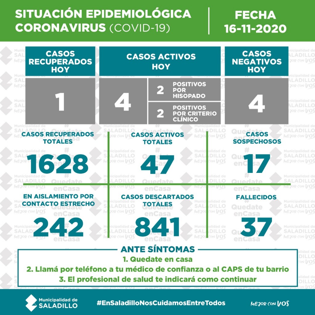 SITUACIÓN EPIDEMIOLÓGICA EN SALADILLO AL 16/11/2020
