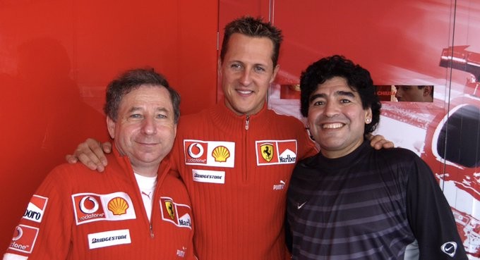 Todt escribió a través de su cuenta de Twitter: “Mónaco 2005, un momento memorable con dos leyendas”. En la foto se lo puede ver al francés junto a Maradona y a Michael Schumacher.