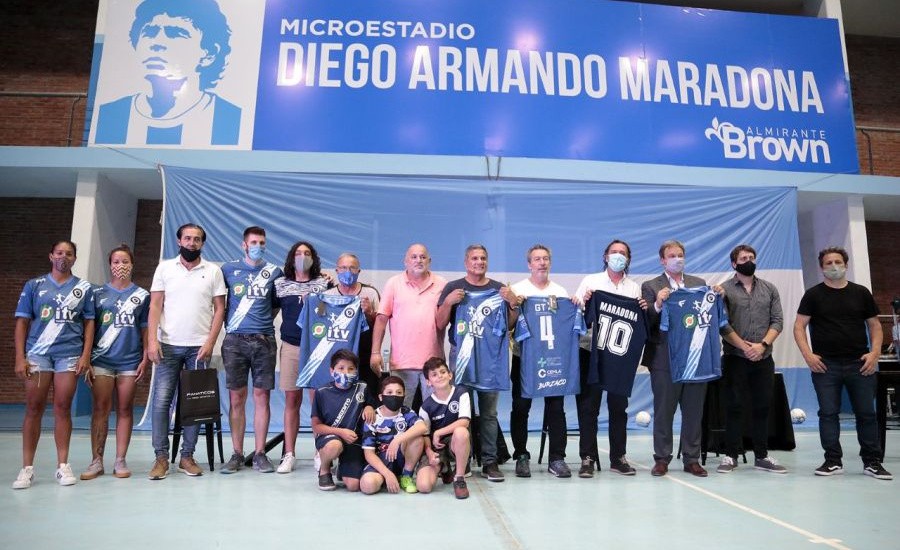 El intendente de Almirante Brown, Mariano Cascallares y los campeones del mundo Héctor (El Negro) Enrique, Julio (El Vasco) Olarticoechea, Carlos Daniel (Chino) Tapia y Sergio (Checho) Batista, encabezaron una emotiva ceremonia durante la cual le impusieron el nombre de DIEGO ARMANDO MARADONA al Microestadio del Polideportivo Municipal de ese distrito bonaerense en homenaje al mejor jugador de fútbol de la historia.