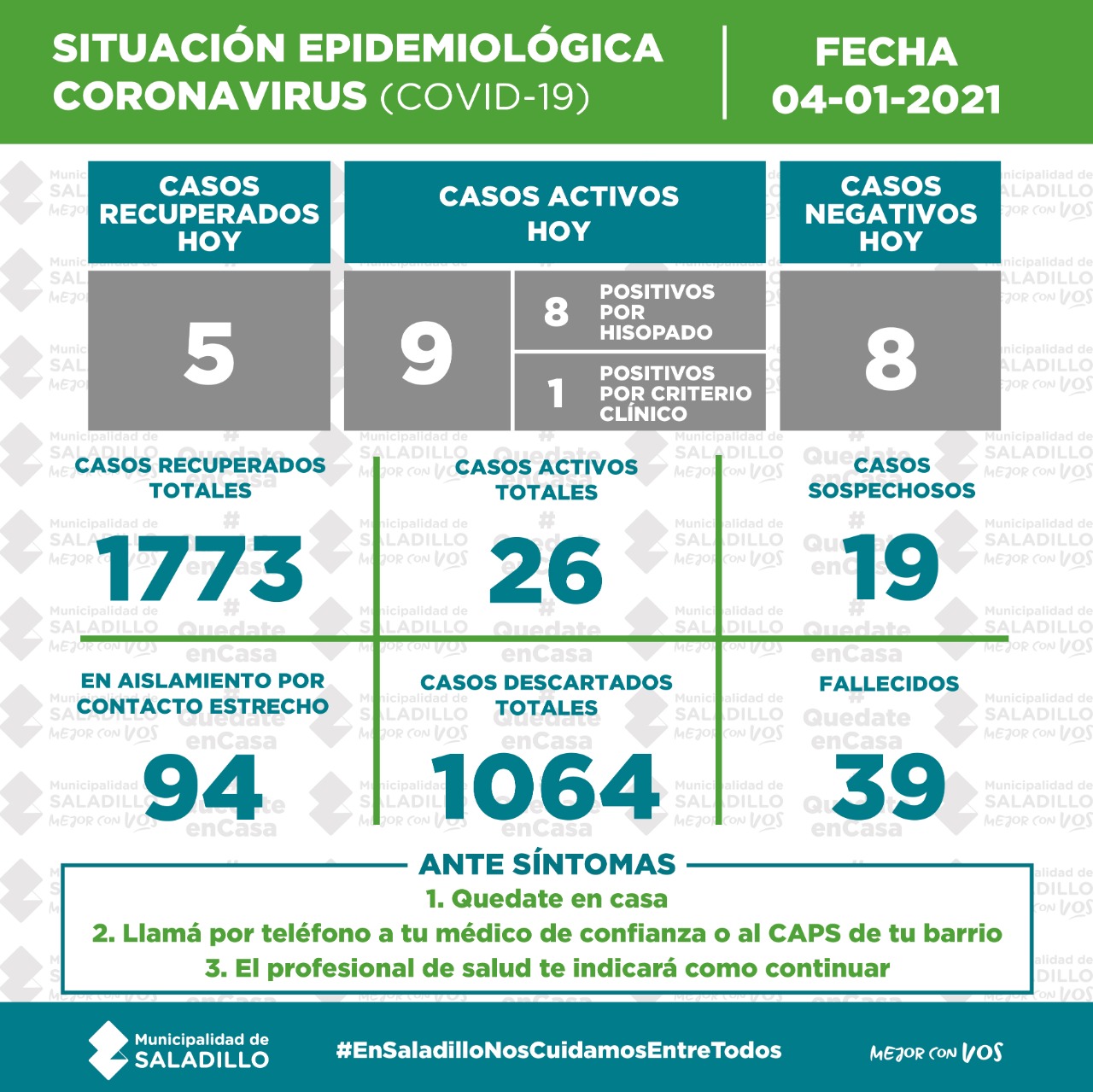 SITUACIÓN EPIDEMIOLÓGICA EN SALADILLO AL 04/01/2021