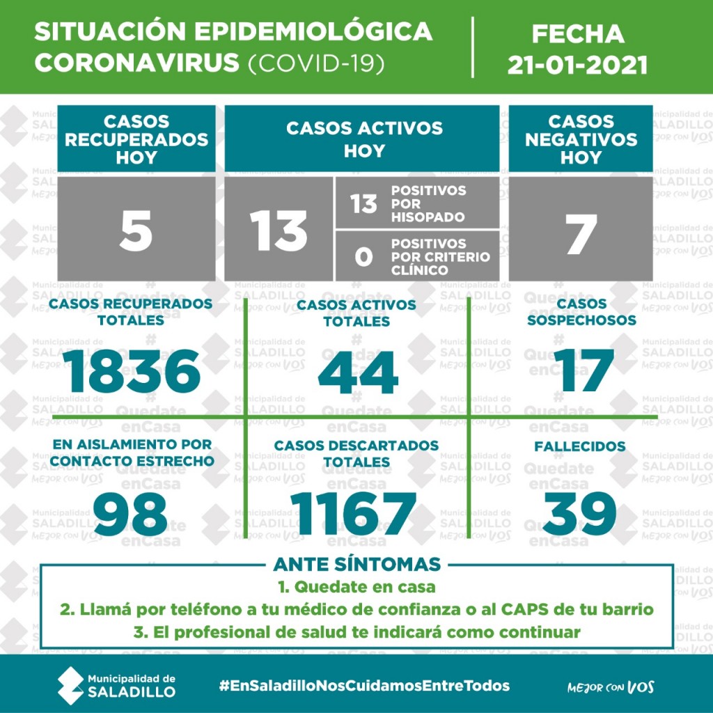 SITUACIÓN EPIDEMIOLÓGICA EN SALADILLO AL 21/01/2021